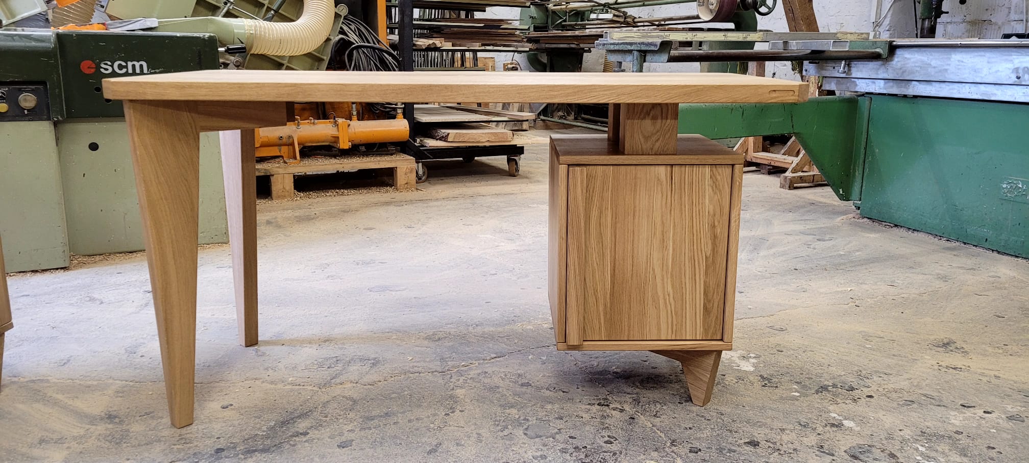 Pod blatem umieszczamy szafkę z cichym domykiem i regulowaną półką, dzięki czemu wygodnie przechowasz segregatory, ładowarki i akcesoria. Szafkę możesz zamontować po lewej lub prawej stronie – w zależności od preferencji. Dodatkowo długie, skośne nogi dodają lekkościoraz poprawiają stabilność. W efekcie blat pozostaje uporządkowany, a praca przebiega sprawnie.