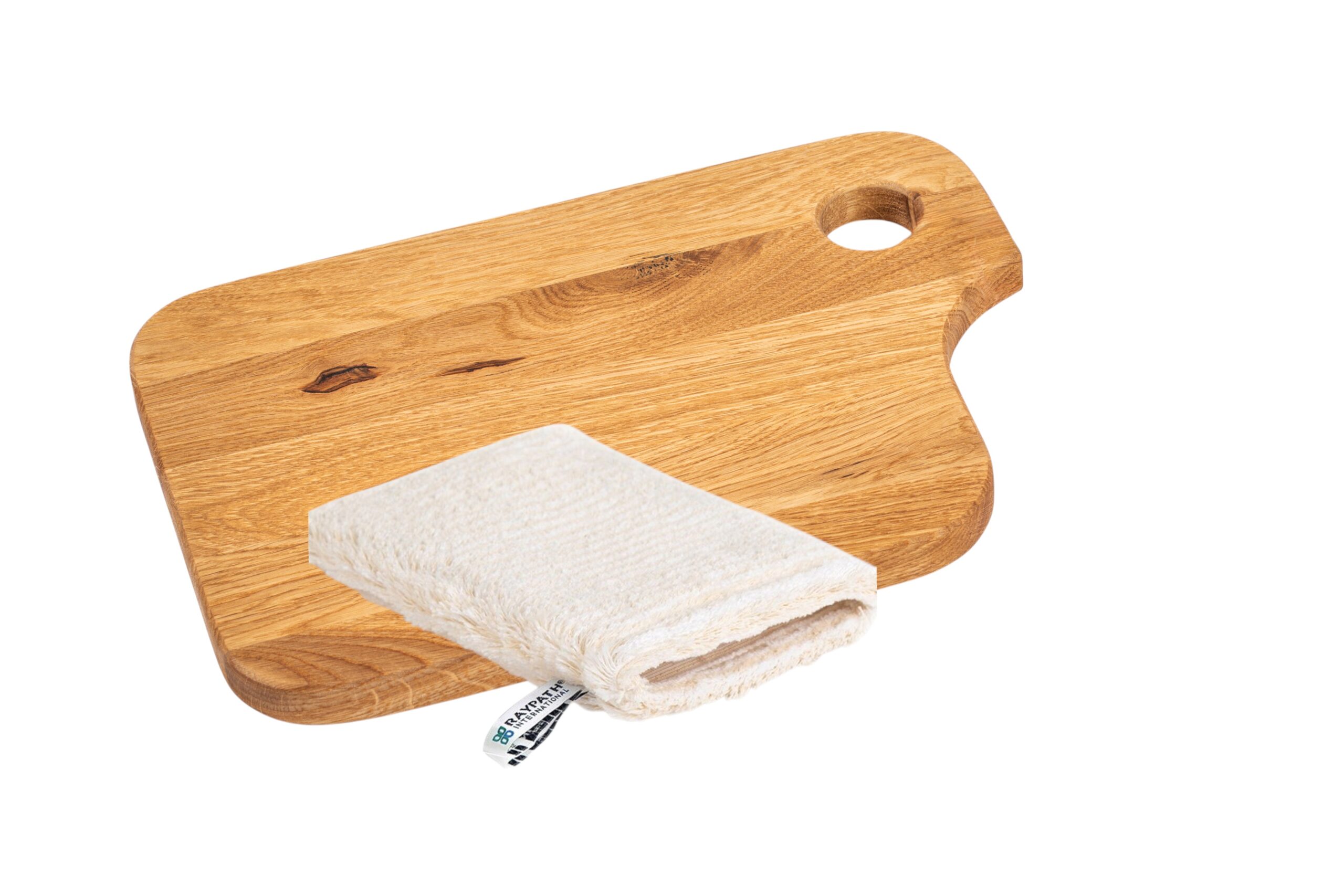Aby drewniana deska służyła przez lata, warto zadbać o nią w odpowiedni sposób. Przede wszystkim nie myj jej w zmywarce i nie pozostawiaj w wodziena dłuższy czas, ponieważ mogłoby to osłabić strukturę drewna. Po każdym użyciu wystarczy przetrzeć ją wilgotną ściereczką,a jeśli zależy Ci na delikatnym, bezpiecznym czyszczeniu, możesz użyć rękawicy Raypath, która usuwa zabrudzeniabez konieczności stosowania detergentów. Co pewien czas warto również zaolejować deskę specjalnym olejem do drewnaPatrei. Dzięki temu powierzchnia zachowuje swoją gładkość, głęboki kolori naturalną odporność na wilgoć. Regularna pielęgnacja sprawia, że deska nie tylko wygląda pięknie, ale też zyskuje większą trwałość na długie lata.